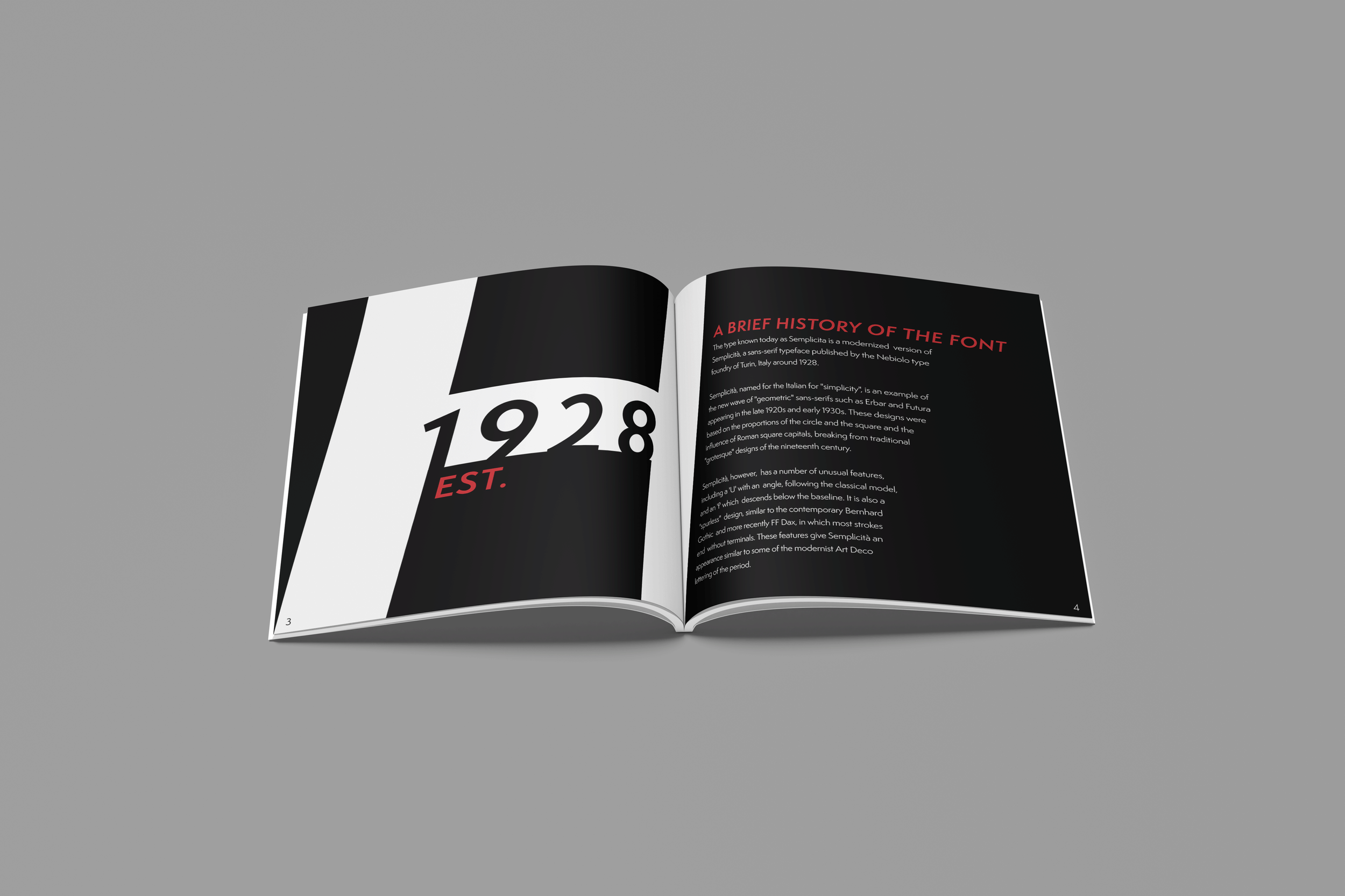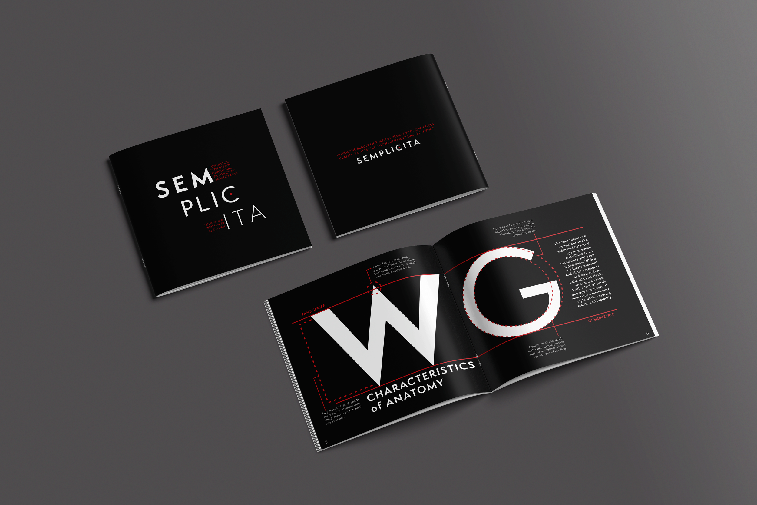 Originally developed in the early 20th century, it reflects the era’s shift toward functional, streamlined forms, prioritizing legibility while maintaining a quiet sense of elegance. Its clean geometric structure, softened by subtle humanist details, informed the book’s pacing, hierarchy, and overall tone. By leaning into its versatility, the project uses Semplicita not just as content, but as a guiding system, allowing its contemporary yet timeless character to shape the visual language of the entire piece.