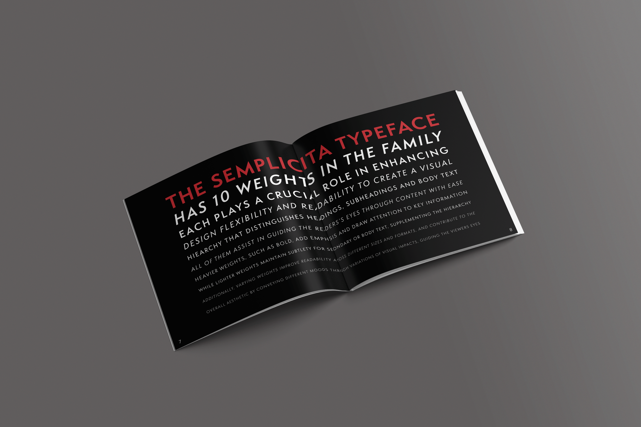 White typography sits sharply against deep black backgrounds, emphasizing clarity and legibility while reinforcing the typeface’s clean, modern character. Red is used sparingly as an accent, guiding the viewer’s eye, highlighting key information, and introducing moments of visual intensity. This limited color system mirrors Semplicita’s balance of restraint and expression, allowing the type itself to remain the focal point while creating a cohesive and striking reading experience.