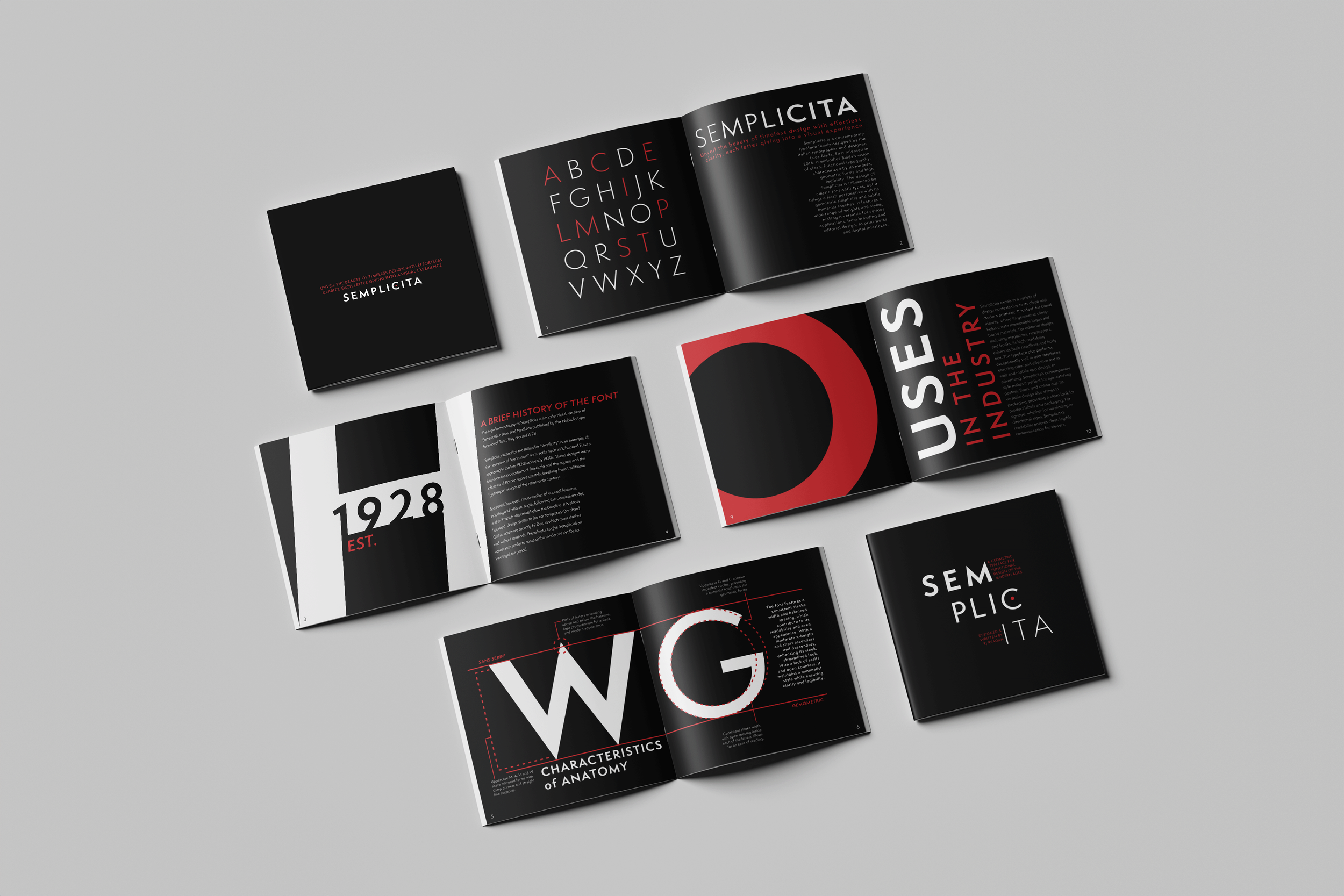 Informed by research into its history and geometric qualities, the design uses the typeface exclusively, relying on variations in scale, weight, and spacing to establish hierarchy and demonstrate its versatility. A restrained palette of black, white, and red creates strong contrast and guides emphasis, while enlarged letterforms and cropped details generate visual interest without additional graphic elements.